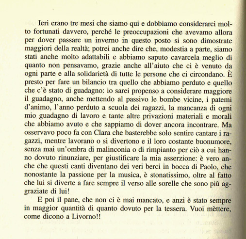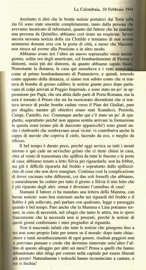 Seconda Guerra mondiale, le vicissitudini di una famiglia ebrea nascosta nelle campagne fiorentine attraverso le parole scritte “in diretta” dal capofamiglia. Qui in particolare risalta la difficoltà di avere notizie aggiornate e veritiere, l’avvicendarsi fitto e contraddittorio delle voci, dei passaparola, degli allarmismi, rende impossibile la quiete anche quando non ci sono bombardamenti.