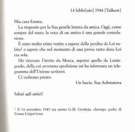 14 Febbraio 1944, Anna Achmatova a Emma Grigor’ evna Gerstejn
