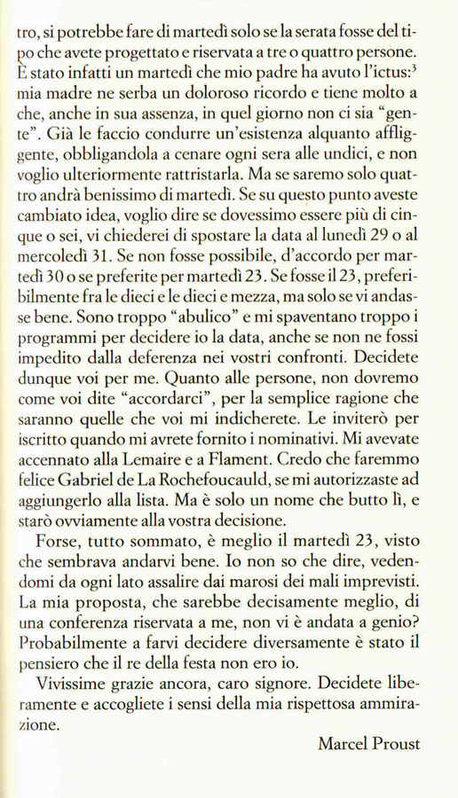 L’autore della Recherche, va da sé, è stato l’imperatore mondiale delle proposizioni subordinate, degli incisi, delle postille, delle precisazioni. Questo è un blando esempio di quale inferno fosse organizzare una serata con lui.