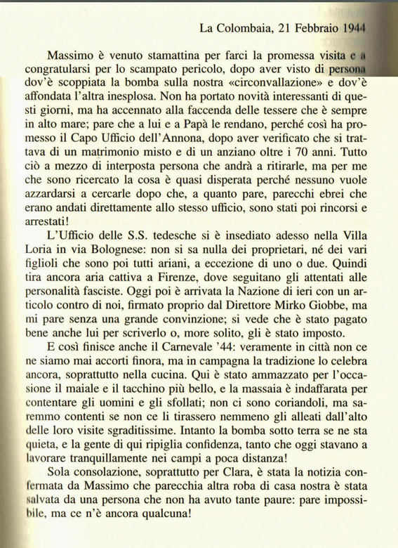Con l’avvicinarsi della fine della guerra le più diverse situazioni prendono a coesistere: i partigiano continuano a morire, aumentano gli attentati ai fascisti, si spera in uno sblocco delle tessere per i viveri, si festeggia il carnevale, le bombe alleate cadono e non fanno solo del bene. La vita continua nei modi più diversi e per noi inimmaginabili.