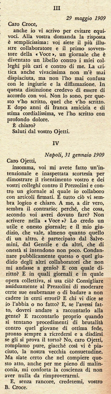 Qui possiamo assistere (confortevolmente impotenti) alla fulminea rottura dei rapporti tra Ugo Ojetti e Benedetto Croce, avvenuta a mezzo stampa.