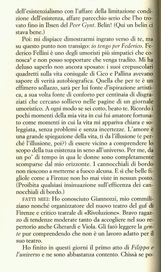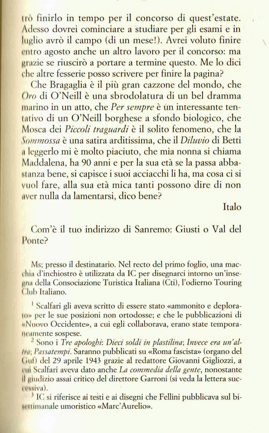Italo, ventenne già esuberante e pirotecnico, scrive al suo compagno di liceo, già palla al piede. Scalfari ha sempre snobbicchiato e trascurato Calvino (oltre a non condividerne i gusti). Qui si parla di Fellini, il Fellini illustratore umoristico, prima della carriera da cineasta.