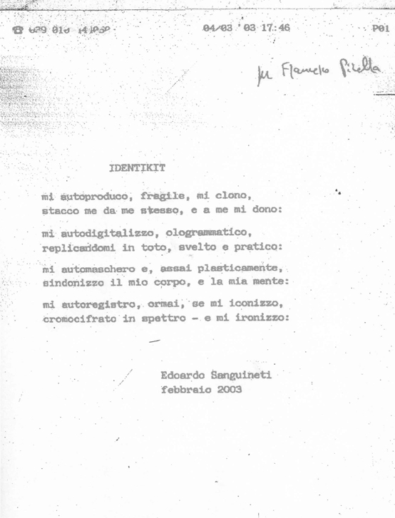 4 Marzo 2003, Edoardo Sanguineti faxa a Francesco Pirella da Edoardo Sanguineti | Carteggi Francesco Pirella