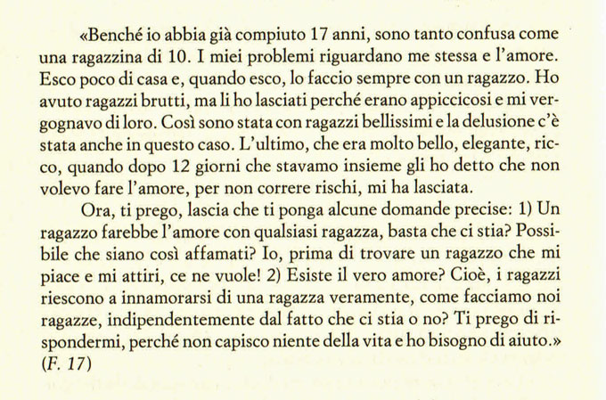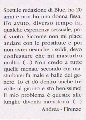Siamo negli anni ’80/’90. La ragazza si chiede sconsolata se esistono ragazzi con aspirazioni che oltrepassino il sesso; il ragazzo dichiara che l’autoerotismo gli va benissimo, tranne per un unico, fastidioso inconveniente.
